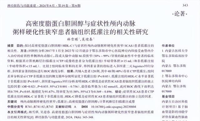 [1]林雪琪.高密度脂蛋白胆固醇与症状性颅内动脉粥样硬化性狭窄患者脑组织低灌注的相关性研究,神经损伤与功能重建,2024-06-12