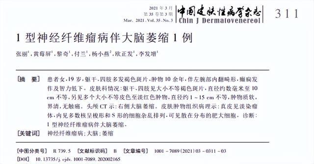 [1]张丽,黄莓屏,黎奇,等.1型神经纤维瘤病伴大脑萎缩1例[J].中国皮肤性病学杂志,2021,35